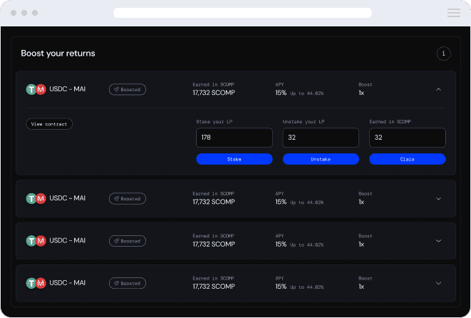 Deposit your liquidity and boost your returns in SCOMP up to 8x through our vote escrow token system.